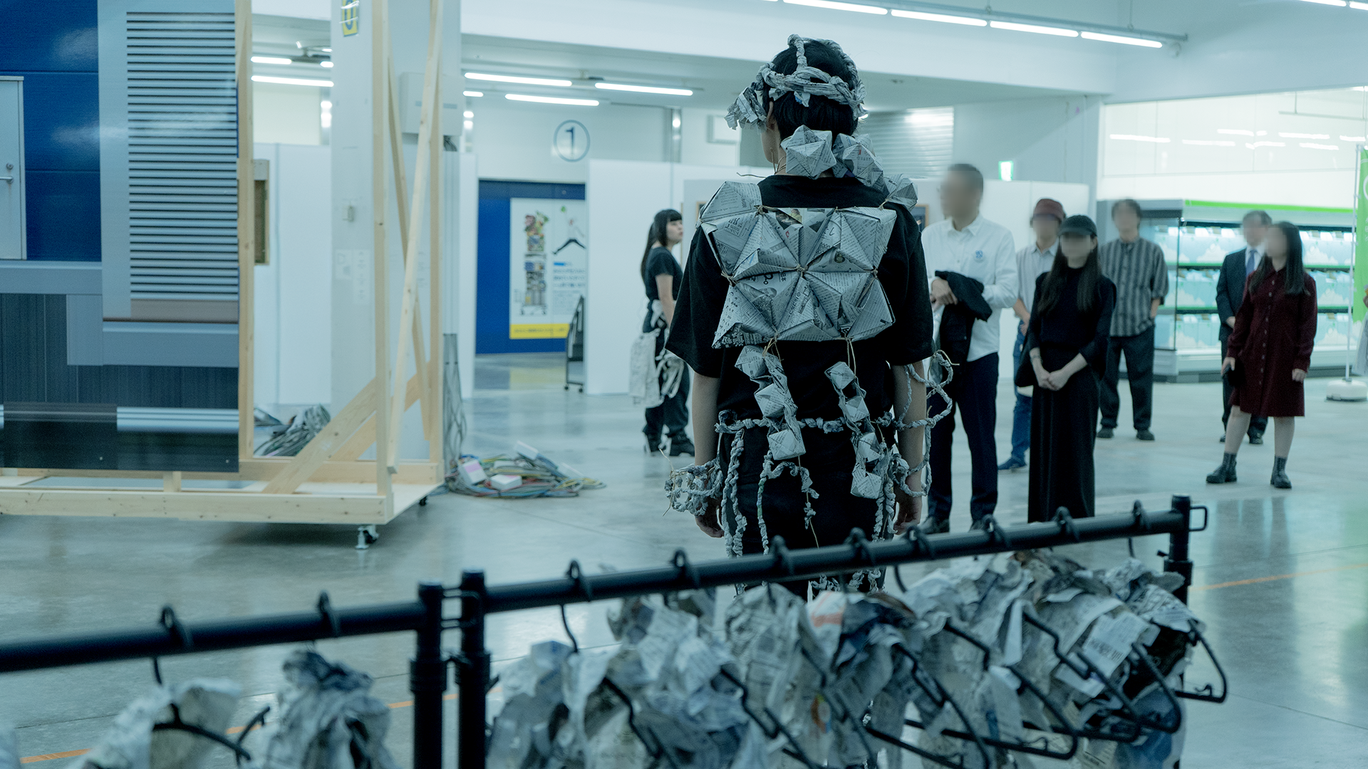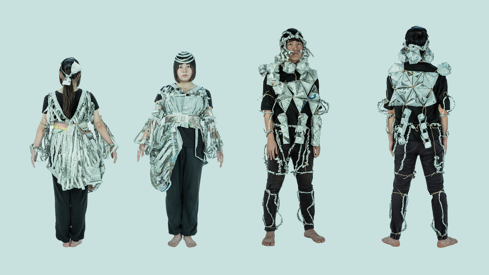 衣装の素材には廃棄予定の新聞紙とそれを束ねる紙紐、また再利用できる形状の手縫糸、針無しホッチキスを使う。”組み”などを用いて接着剤を使わずに制作する。