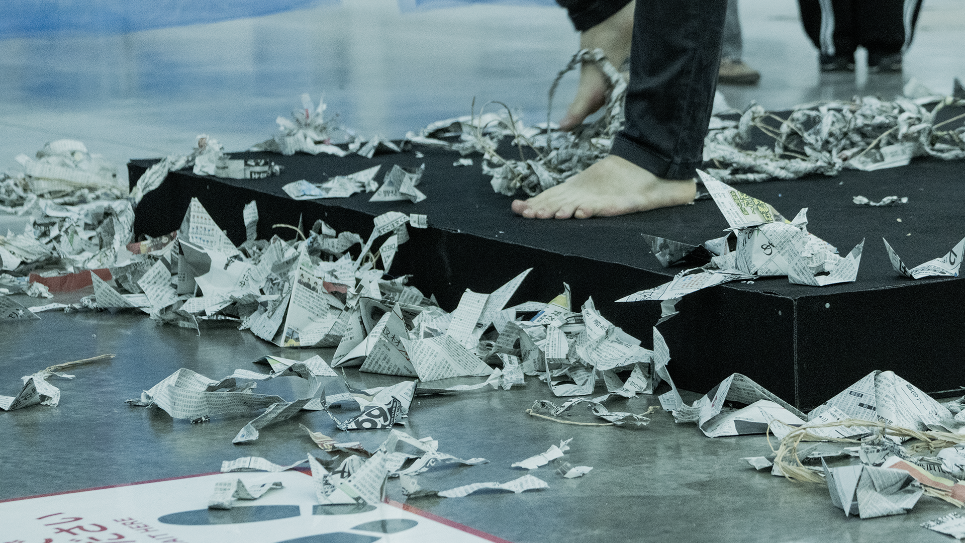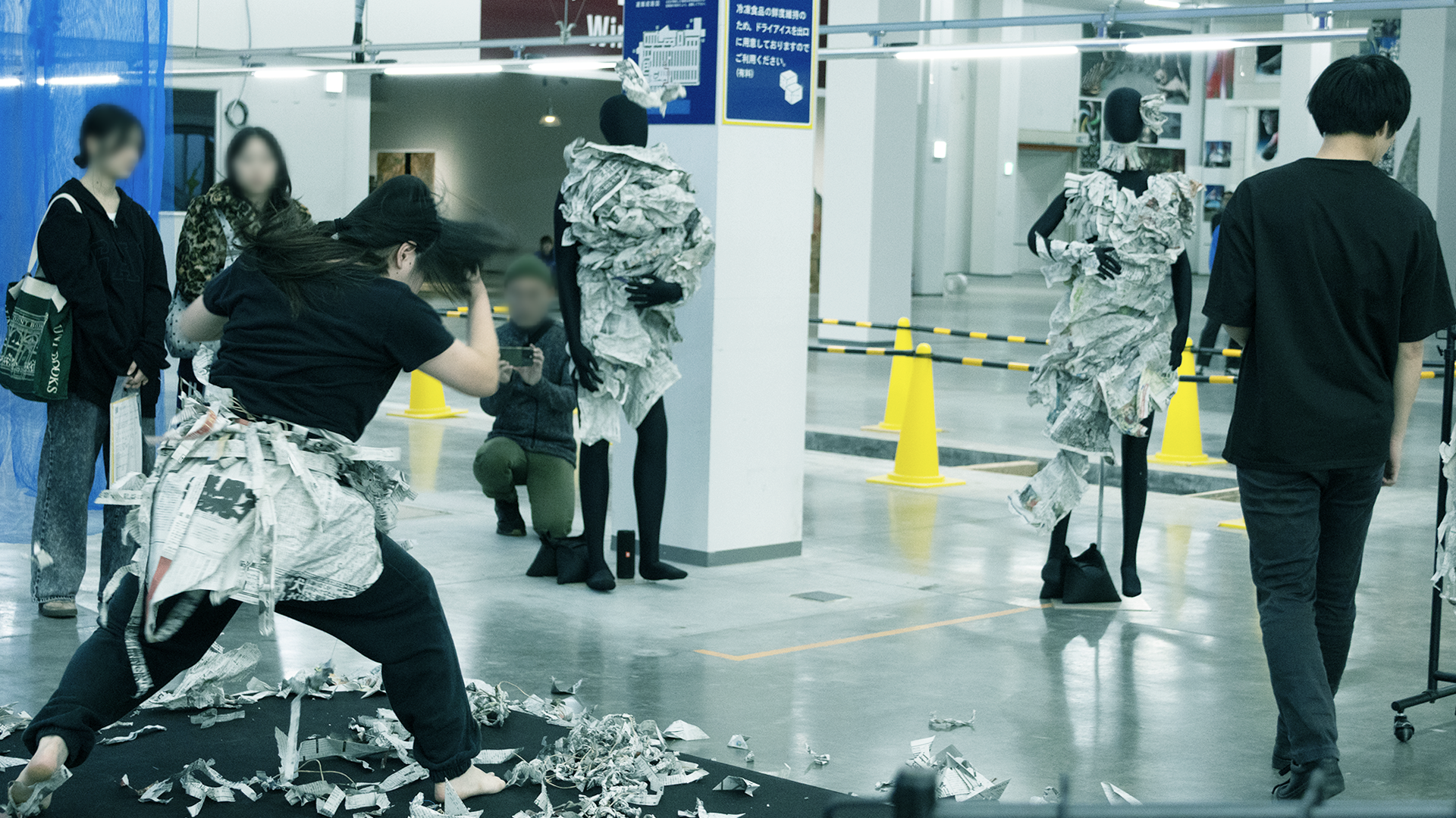 新聞紙は廃棄予定のものを使用し、結合には折りや組みなどを用いて接着剤を使用せず製作。作品が終わった後も新聞紙が資源ごみとしてリサイクルされ、再び私たちのもとへ循環し、ものの生産・消費、そしてゆくえについて問い続ける作品であることを目指している。