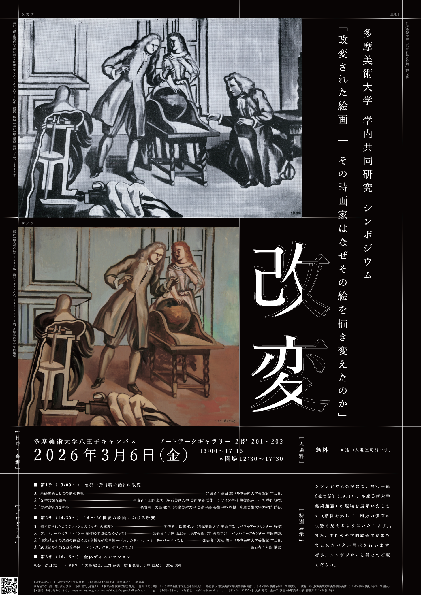 多摩美術大学の学内共同研究の一つとして2025年4月に設立された「多摩美術大学『改変された絵画』研究会」では、福沢《魂の話》の改変問題を出発点として、さらに、他の画家「本人」による「絵画」作品の「完成後」の塗り変えや切断などの「改変」作業について、16~20世紀におけるさまざまな事例を分担して調査研究しています。