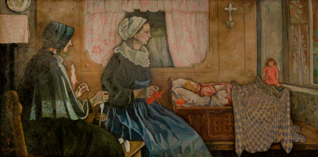 M120号の画面に室内を描き、3人物を並置する構図をとる。画面左方には糸車を手に支える老年の女性、中央には両手で毛糸を編む壮年の女性、右手には画面奥に置かれた寝台に仰臥する稚児が描かれる。着座する左方と中央の女性の顔に光が射す様子は、朝日の差し込む窓辺が画面外の右手にあることを示唆していよう。
